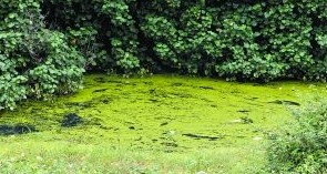 水塘靠近公路的一旁長滿了浮萍,水塘水黑如墨