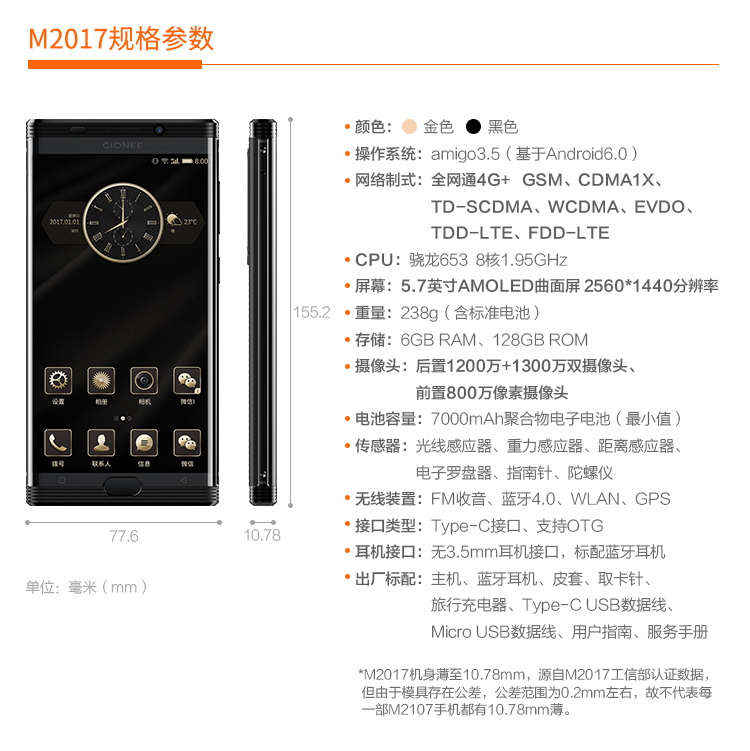 作為金立首款進軍高端市場的旗艦產品,金立M2017的定價自然也很高端。金立M2017 6GB+128GB版本售價:6999元。此外,金立還推出了限量版的6GB+128GB鱷魚皮私人定制版,售價16999元。